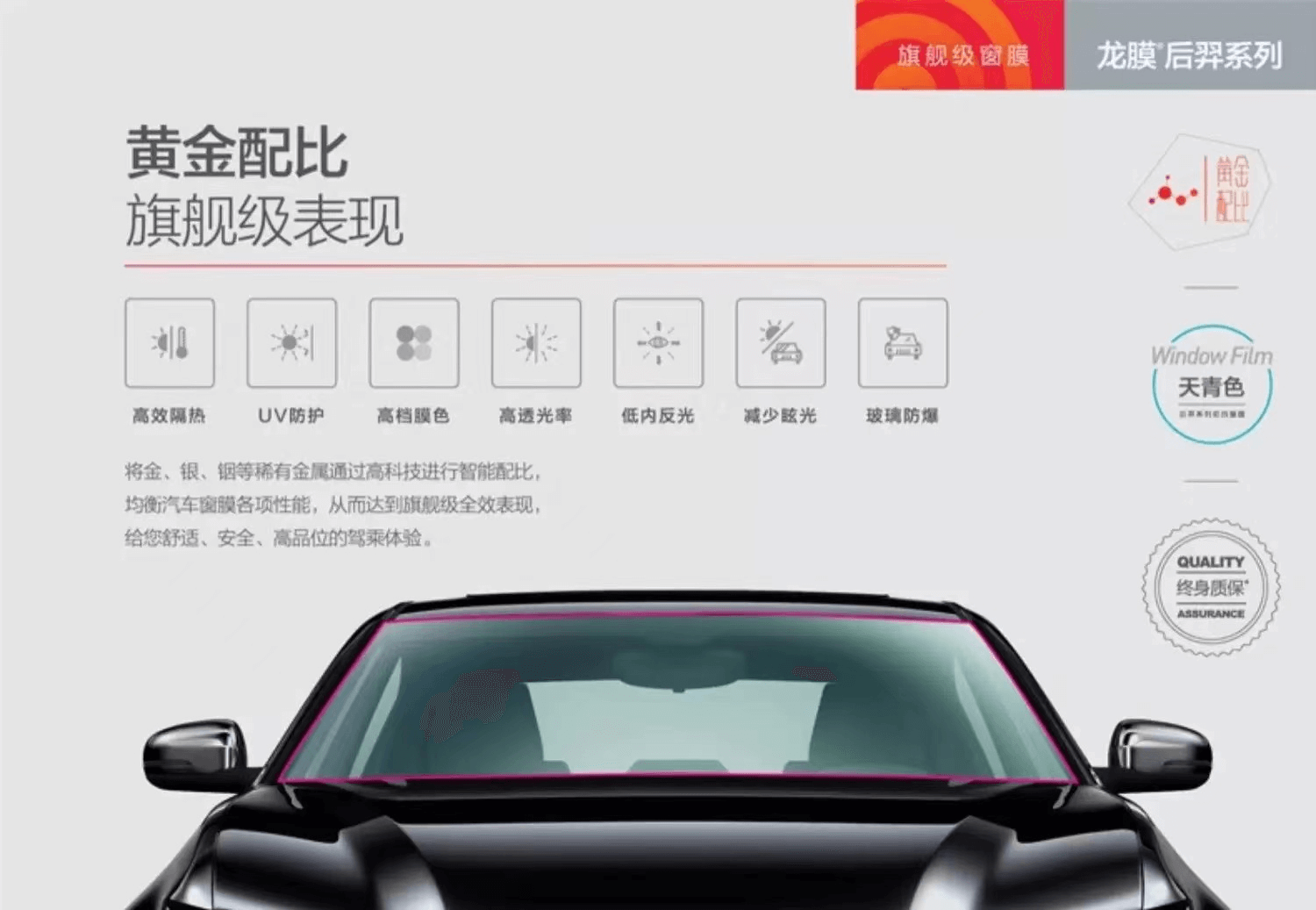 性能参数:可见光穿透率约为72%,紫外线阻隔率在99%以上,太阳能总阻隔率约为54%,可见光反射率约为8%。该款汽车膜提供终身质保。