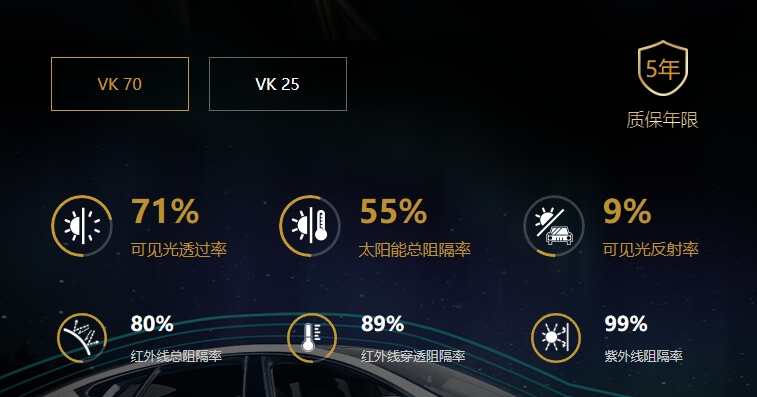 如:威固VK70+前后侧窗K35。对于自带隐私玻璃的车辆,前后排皆选择浅色膜,可以在视觉上达到统一效果。