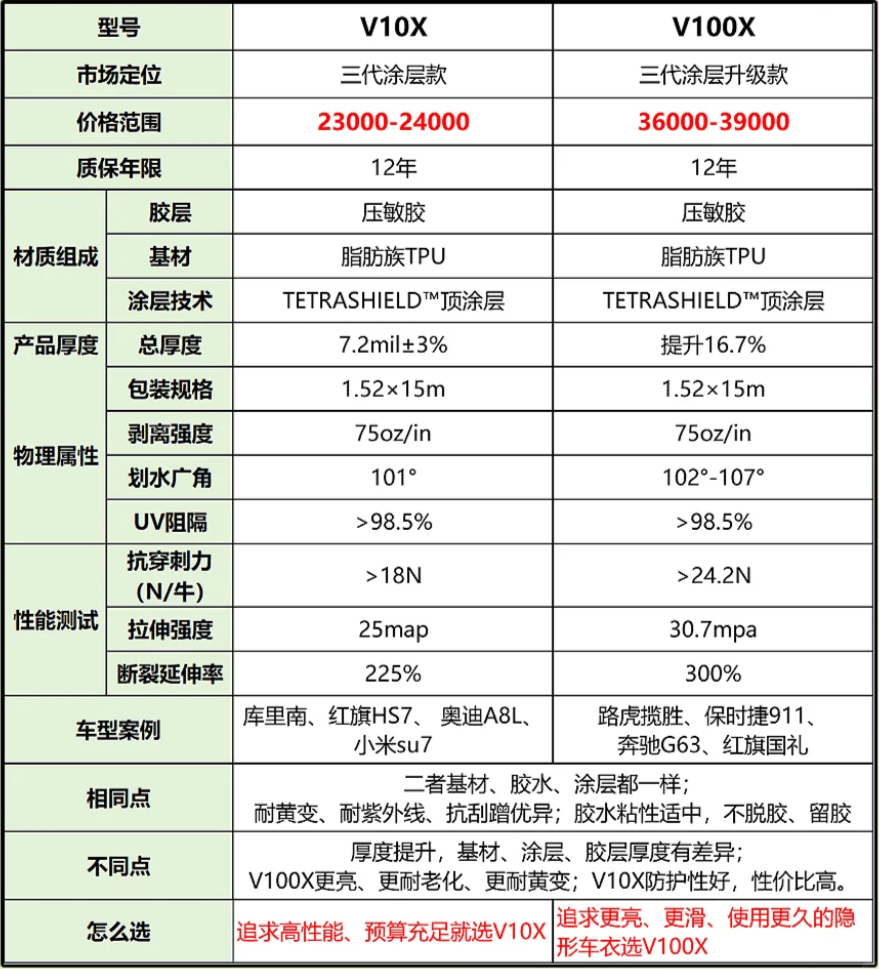 V10X 能在保证基本保护性能的同时,为您节省一定的费用。而如果您对车衣的防护性能有更高的要求,那么V100X无疑是更优的选择。它能为您的爱车提供更全面、更持久的保护。