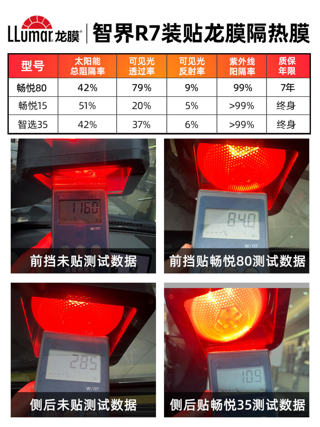 智界R7施工龙膜畅悦80+畅悦35/15,有效隔热,续航无衰减。