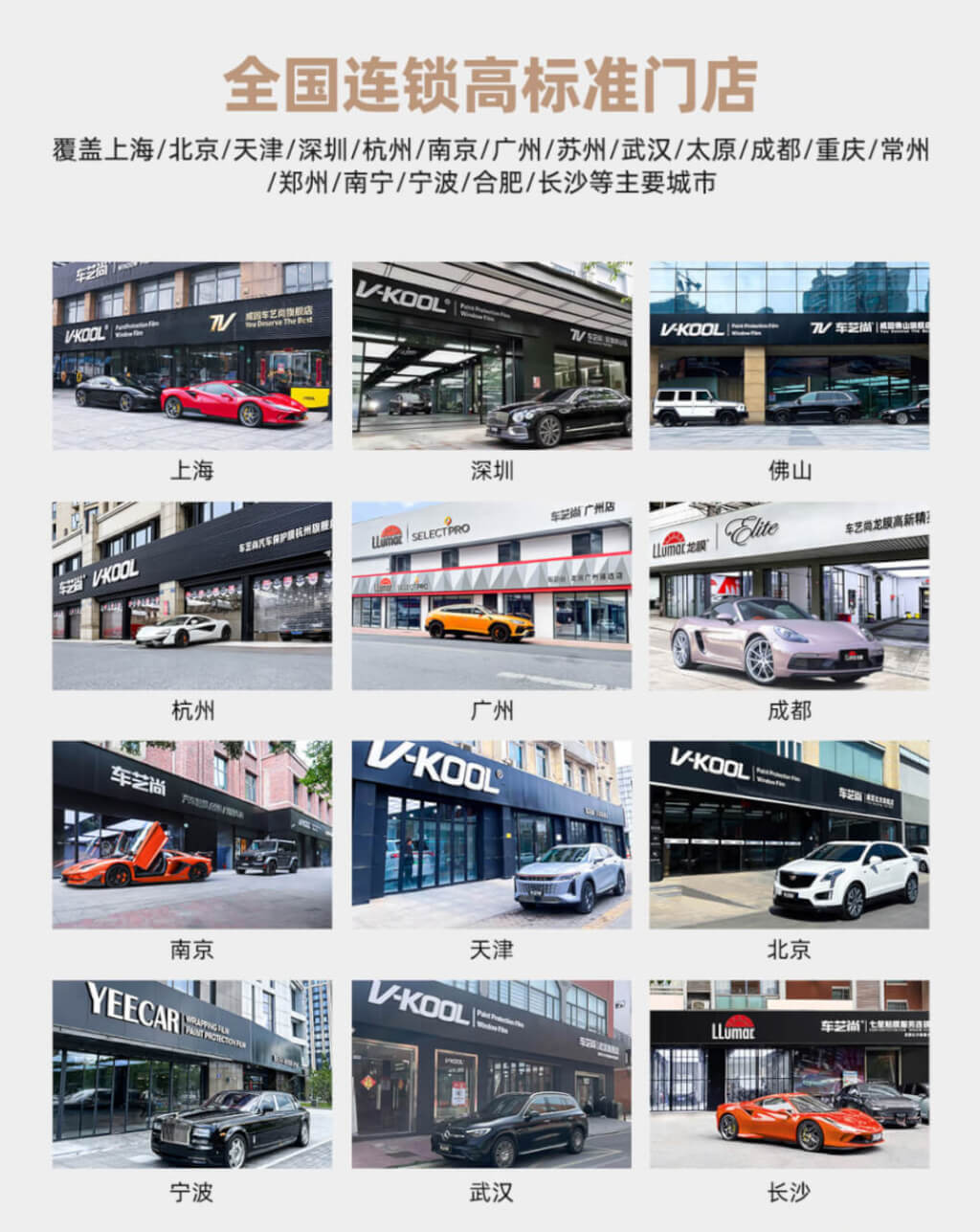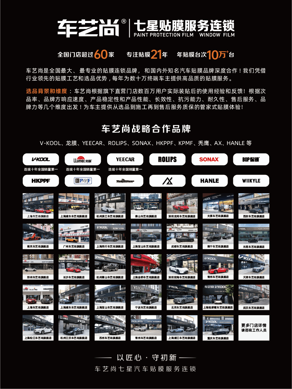 作为国内较早的专业汽车贴膜品牌,车艺尚已先后与威固、龙膜、罗利普斯、YEECAR、AXFilm、SONAX等国际主流汽车服务品牌建立了长期战略合作。