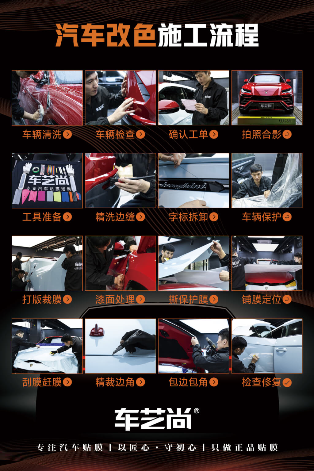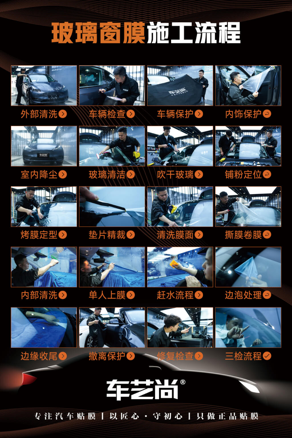 在汽车贴膜技术领域,车艺尚持续推动施工工艺的标准化与精细化,围绕“更安全、更精准、更高效”的施工理念,形成了多项独创工艺,成为行业技术升级的实践样本: