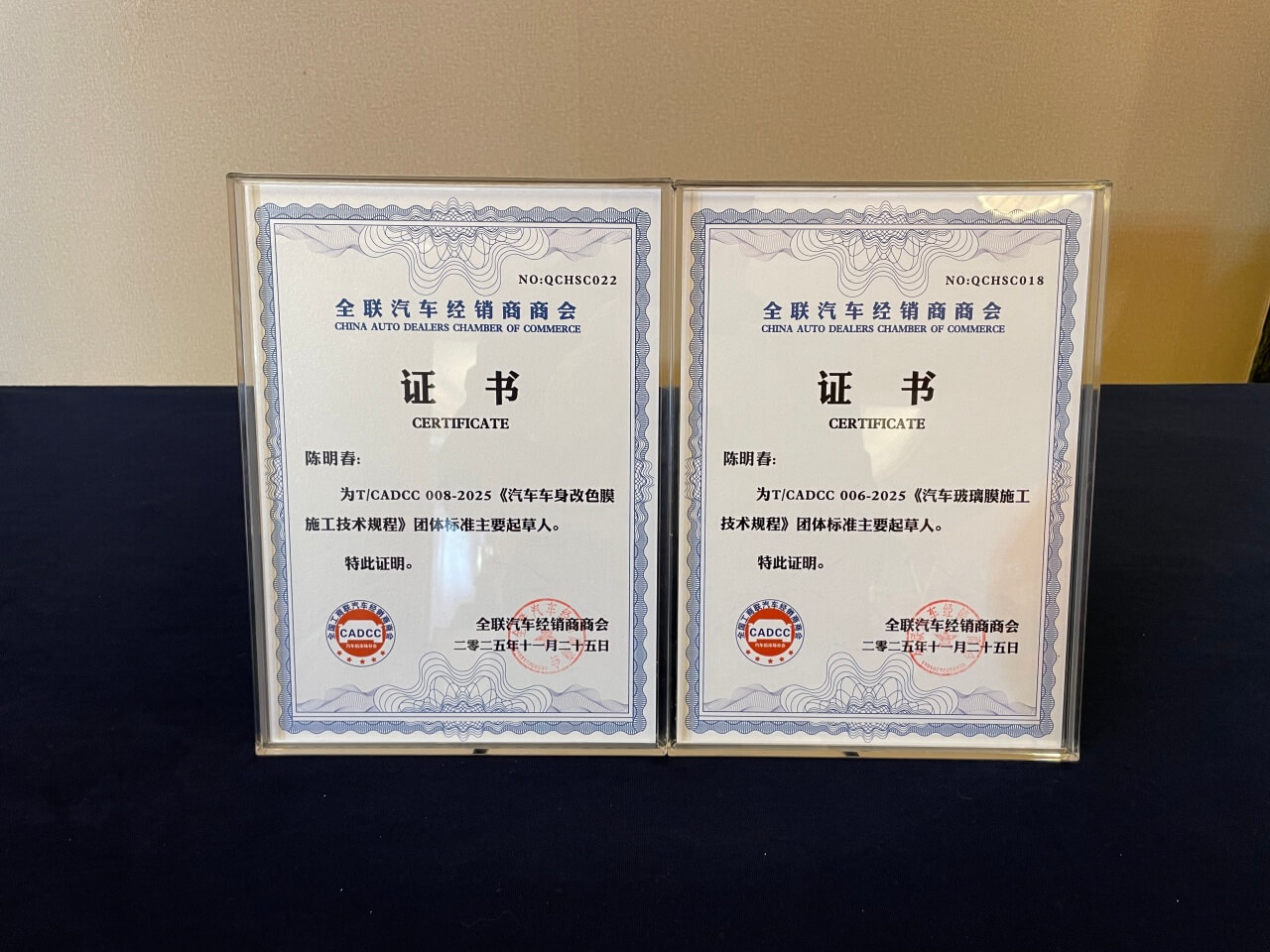 获得《汽车玻璃膜施工技术规程》与《汽车车身改色膜施工技术规程》核心起草人