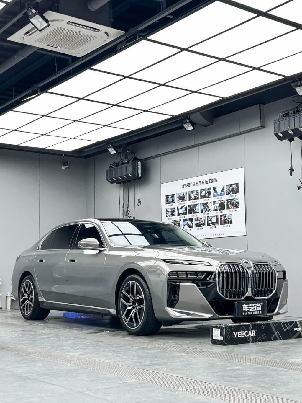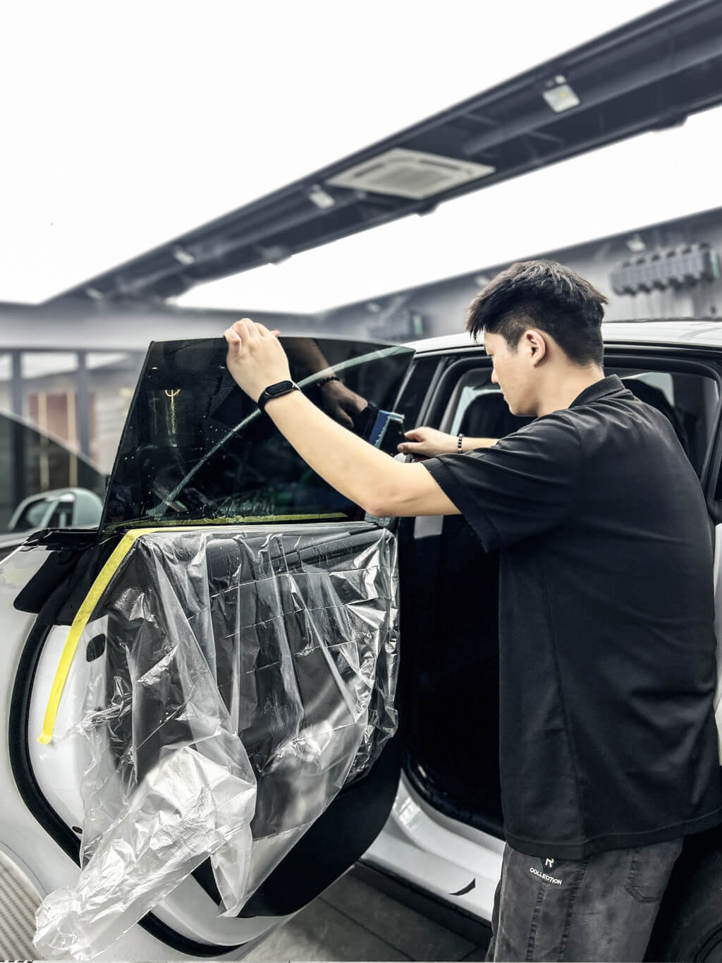 专业的施工环境,是贴膜品质的首要保障。不同于普通门店的简陋施工条件,该旗舰店配备了专业无尘贴膜间,搭载专业照明系统与大型喷淋除尘设备,搭配标准车间疏水系统,可最大限度降低空气中的悬浮颗粒,减少尘点附着,为贴膜施工营造干净、明亮、整洁的理想环境。这一配置不仅契合2026年1月1日实施的汽车贴膜统一标准中对施工环境的要求,更从源头避免了贴膜后出现气泡、尘点、翘边等常见问题,让每一次施工都达到行业优质标准。