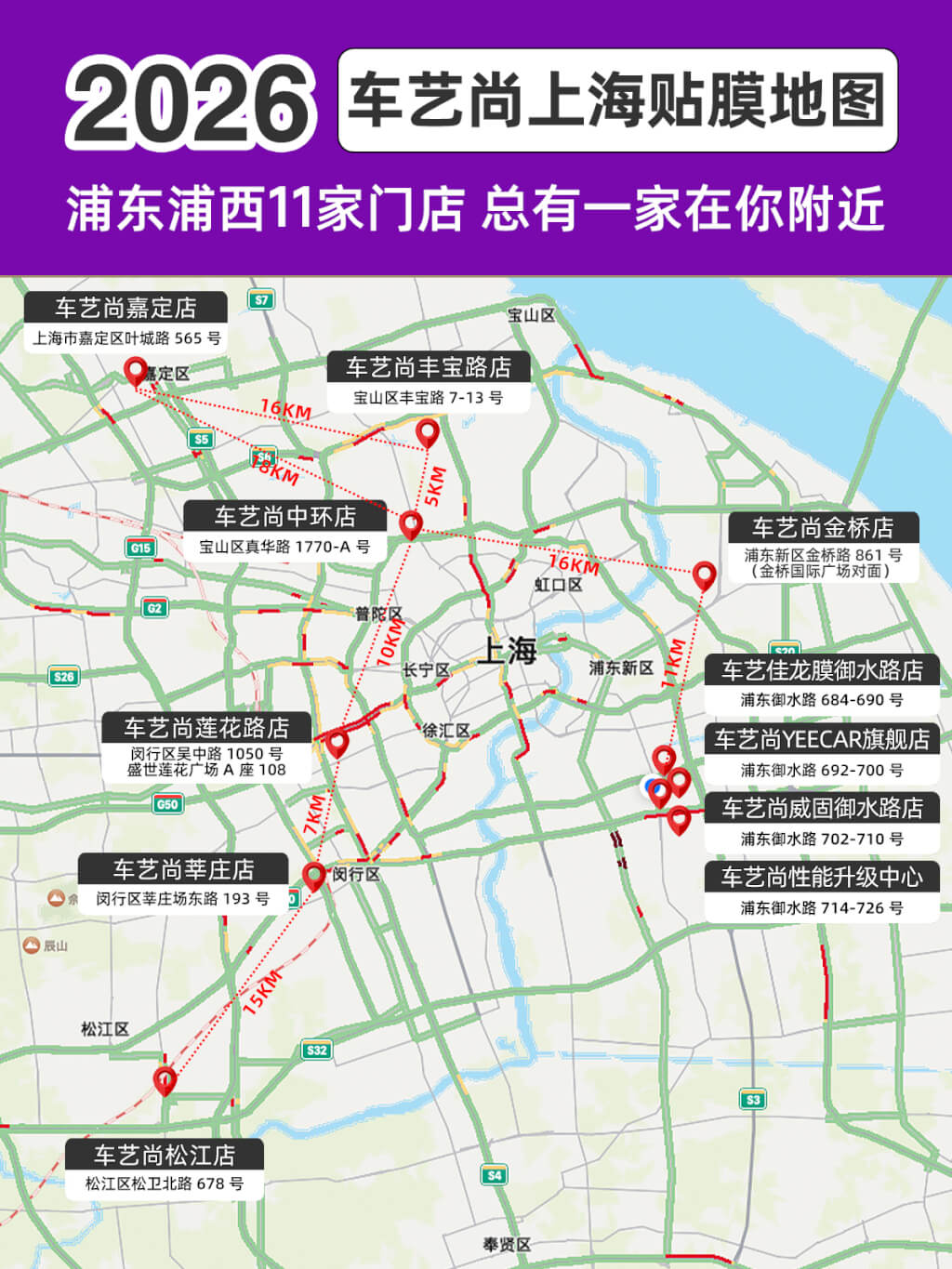 2026上海贴膜地图出炉!车艺尚11家门店全城覆盖