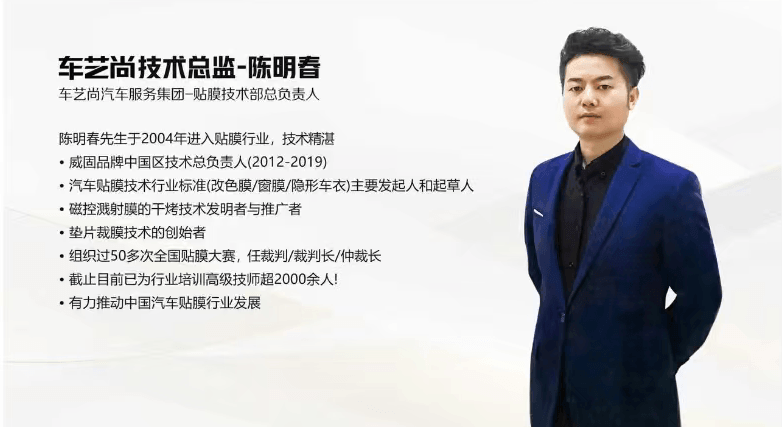 陈明春先生于2004年进入贴膜行业,深耕二十余载,是中国汽车贴膜技术的开拓者之一。其核心履历包括: