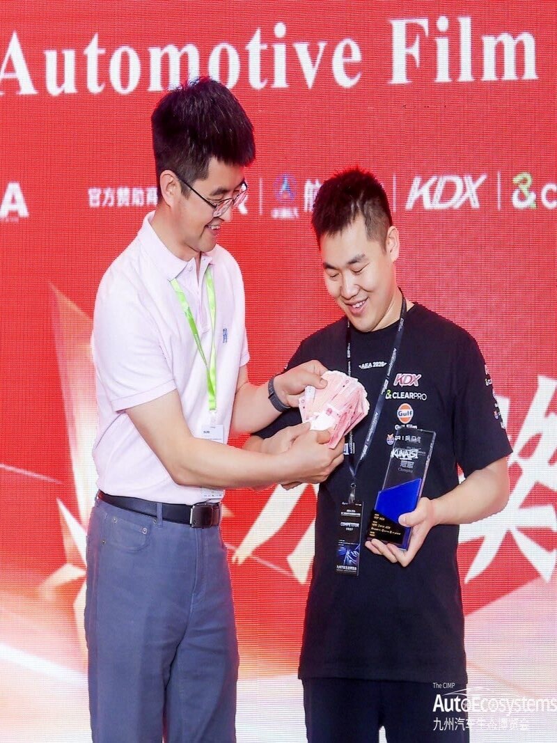 值得一提的是,车艺尚与AEA赛事的渊源远不止于此。在2024年AEA中国汽车膜装贴大师赛(杭州站) 的舞台上,车艺尚技师丁丁凭借炉火纯青的技艺,一举斩获双料冠军。这一殊荣不仅印证了车艺尚在施工领域的顶尖实力,更展现了车艺尚深厚的技术底蕴。