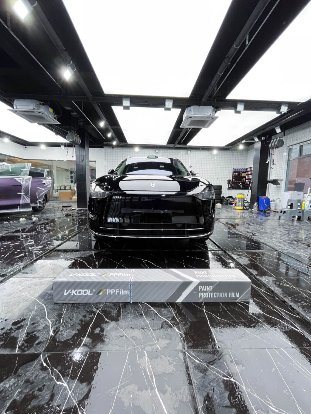 车艺尚武汉店配备了专业照明系统和大型喷淋除尘设备,以及标准的车间疏水系统,可以最大限度降低空气中的悬浮颗粒,减少尘点附着,施工环境干净、明亮、整洁。在核心技术方面,车艺尚拥有行业领先的五大工艺: