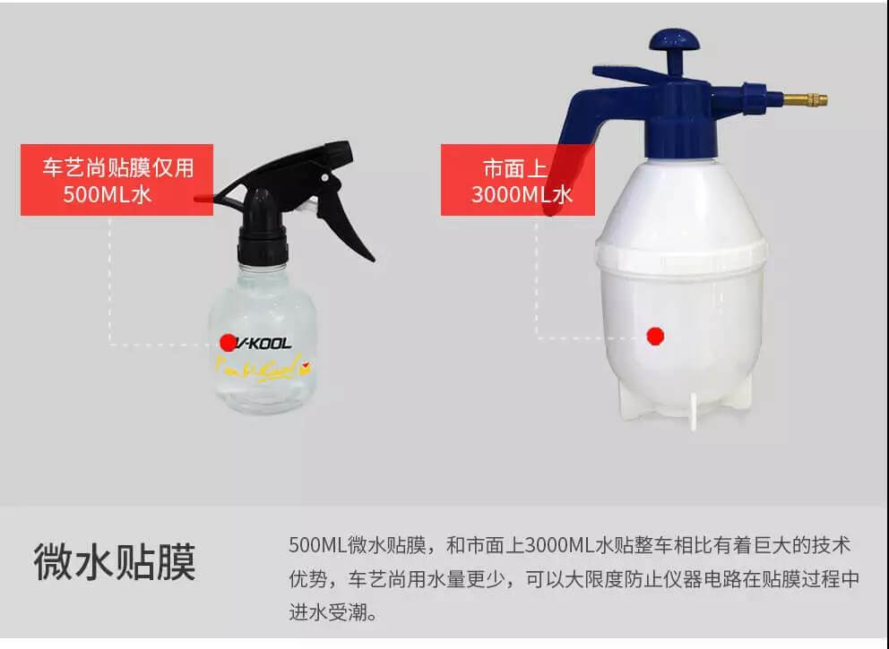 2005年,首创500ML微水贴全车膜,重新定义了隔热膜安装标准,不留污渍、不损电路,是高品质施工的一个必备要素。