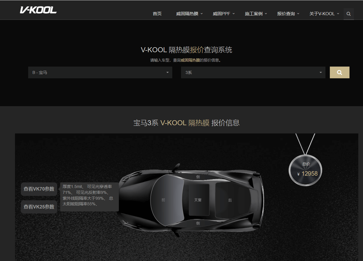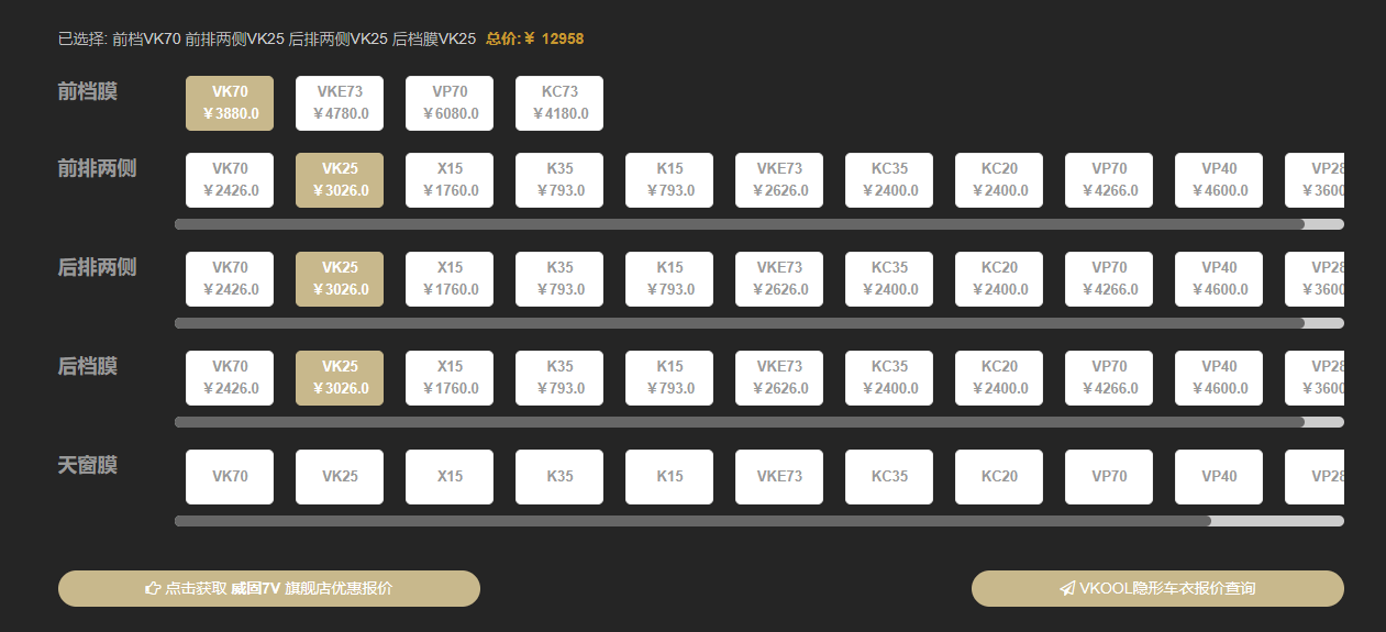 如你所见,宝马3系威固VK70前挡价格(官方报价)为3880元,前排两侧挡VK25官方报价3026元,同样是VK25车身(即侧后挡)官方报价3026元,后档膜也用VK25型号价格3026元,天窗膜暂时未算入其中,所以全车官方报价=3880+3026*3= 12958元。值得一提的是,威固官方报价并不等于门店实际售价,一般来说,实际售价都会有稍许的优惠(如果遇到活动会有对应的折扣)。当然,如果你想了解当下的一个实际优惠价,也可以点击右侧的【在线咨询】进行线上咨询,或者直接拨打官网电话400-808-1165和官方客服一对一沟通,对价格会有更深入的了解。