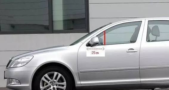 汽车贴膜颜色过深,或太深,通常发生在侧挡,特别是主副驾驶看左右后视镜部位,颜色太深,视线会非常难受。这种情况,解决汽车贴膜颜色过深的一个方法就是,在左右两边裁剪出大小相等的三角区,尺寸通常是窗角往右25cm,垂直裁下,如下图: