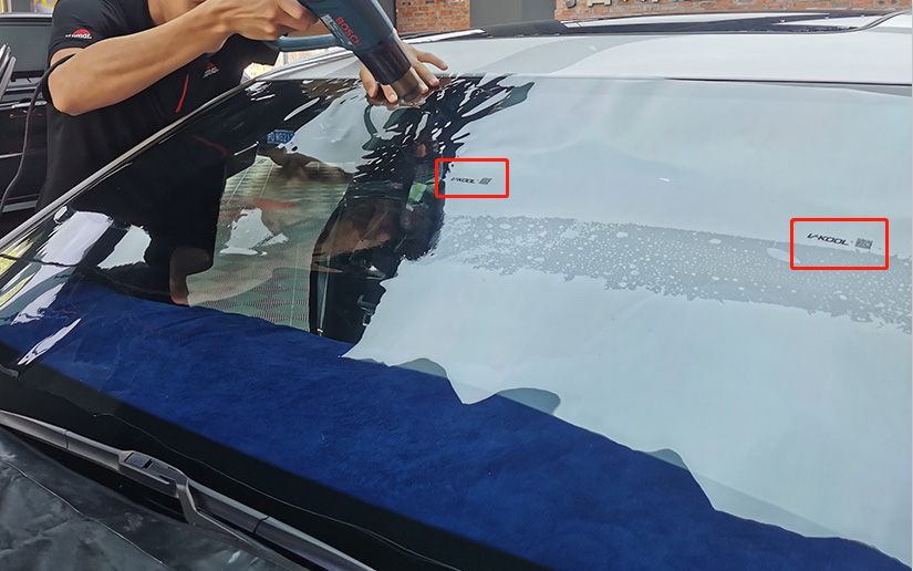 与隔热膜贴在车窗内不同,标贴一般贴在车窗外(如下图)。